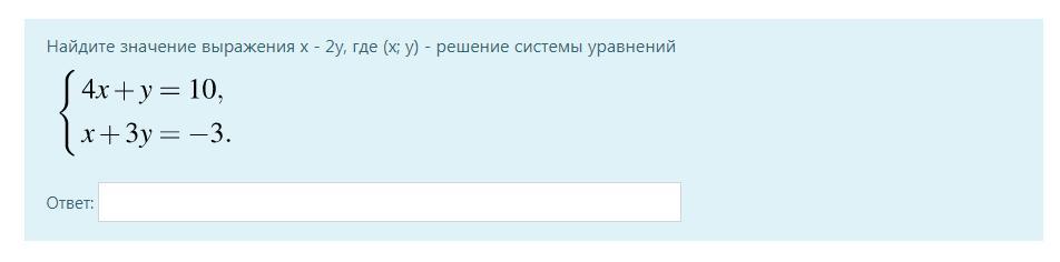 \left \{ {{4x+y=10} \atop {x+3y=-3}|*(-4)} \right.\\\\\\+\left \{ {{4x+y=10} \atop {-4x-12y=12}} \right. \\--------\\-11y=22\\\\y=-2\\\\x=-3-3y=-3-3*(-2)=-3+6=3\\\\x-2y=3-2*(-2)=3+4=7\\\\Otvet:\boxed{7}