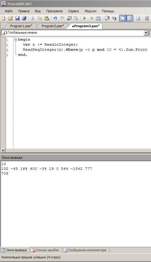 Напишите программу, которая в последовательности натуральных чисел определяет сумму чисел, оканчивающихся на 4. Программа получает на вход количество чисел в последовательности, а затем сами числа. В последовательности всегда имеется число, оканчивающееся на 4.