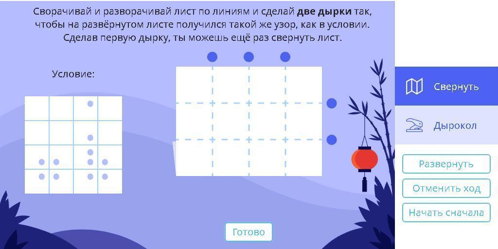 Сворачивай разворачивай лист по линиям и сделай 2 дырки так чтобы на развернутом листе получился такой же узор как в условии сделав первую дырку ты можешь еще развернуть лист ОЧЕНЬ СРОЧНО!!!! осталось 25 минут