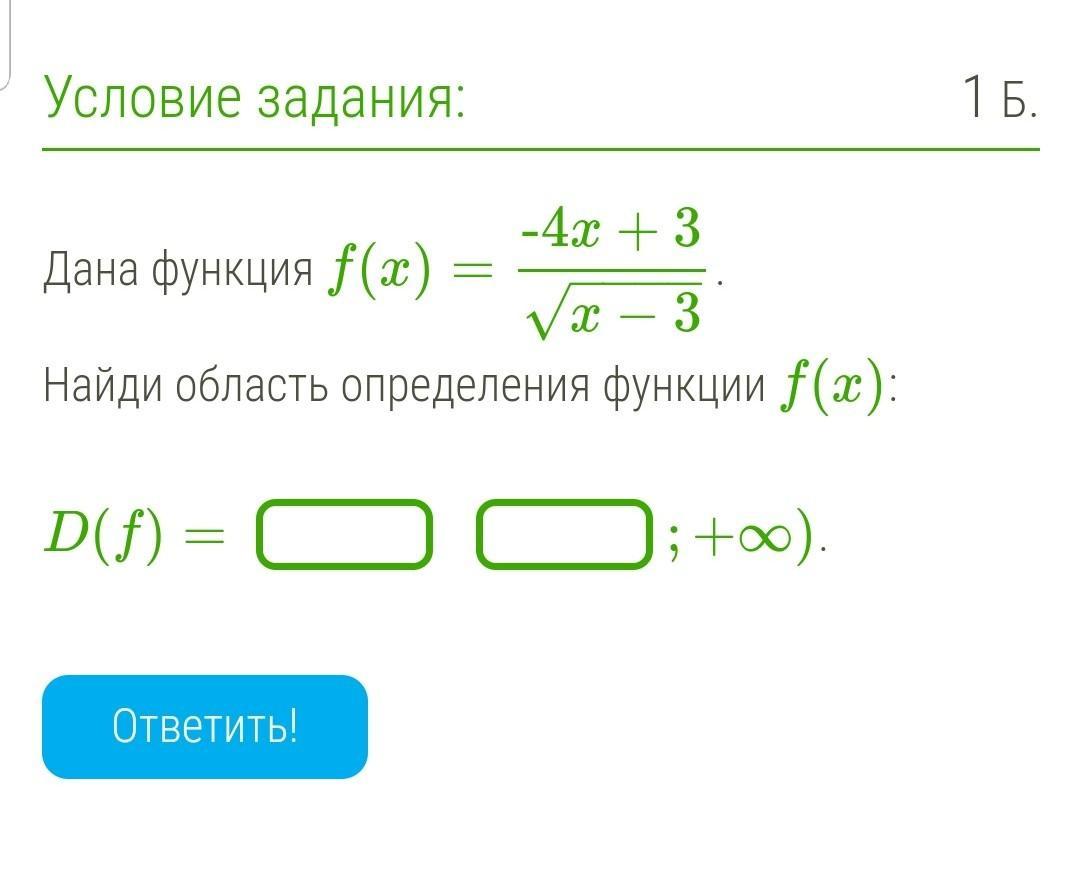 Ну из-за того что знаменатель не может быть равен нулю то, х не может быть равен 3, а с учетом того, что в знаменателе корень, а корень не может быть отрицательным, то ответ (3;+бесконечность)