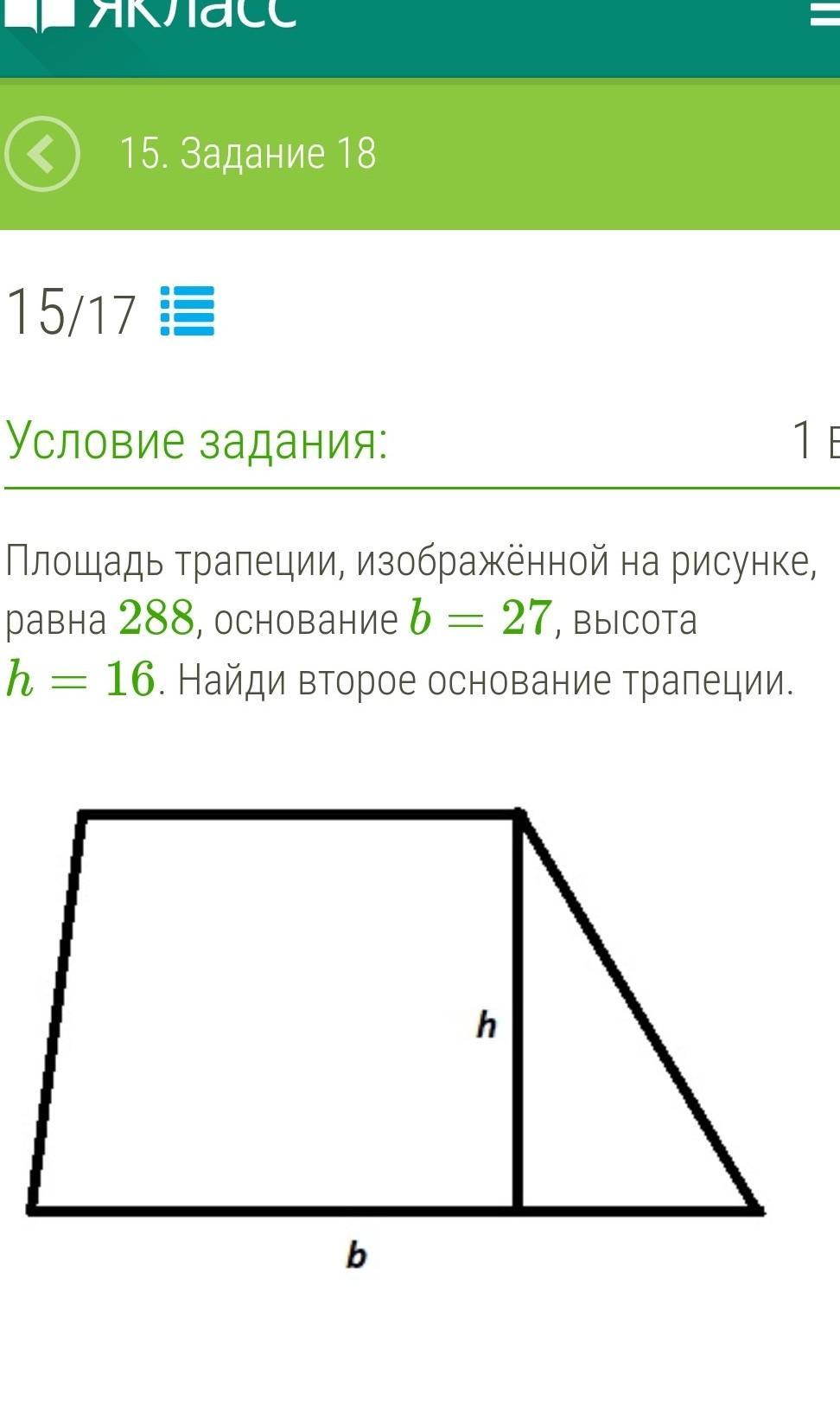 Решите умоляю.Площадь трапеции, изображённой на рисунке, равна 288, основание b=27, высота h=16. Найди второе основание трапеции.