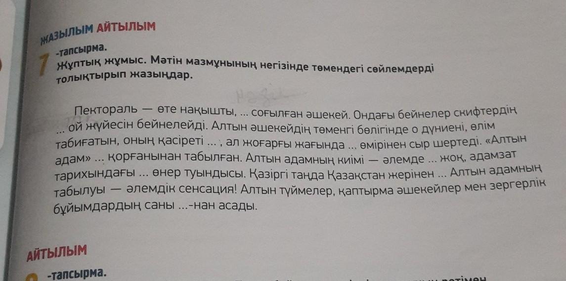 Пара работает. На основании содержания текста под предложениями Написать комплемента. Пектораль очень тонкая, ... украшенная мозаикой. Изображения скифов отражает систему мышления. В нижней части золотой мозаики мир мертв его природа, его трагедия и верхняя сторона .... «Золото Человек ".. Найден в замке. Одежды золотого человека нет мире .. человечество в истории ... работа. В наше время это земля золота ... Находка - сенсация в мире! Золотые пуговицы, ювелирные украшения и украшения Количество продуктов превышает.