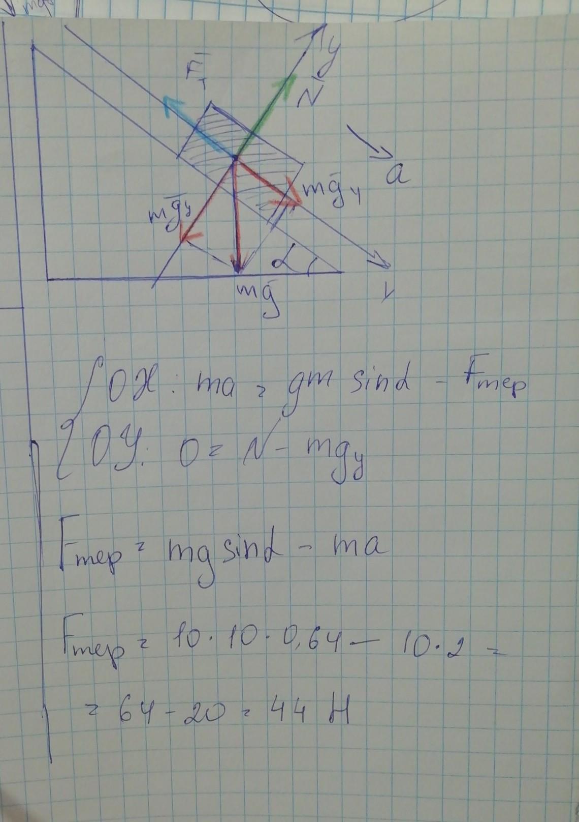 Тіло масою 10 кг зісковзує з похилої площини,кут нахилу якої 40°.Визначте силу тертя,що діє на тіло,якщо воно рухається з прискоренням 2 м/с².