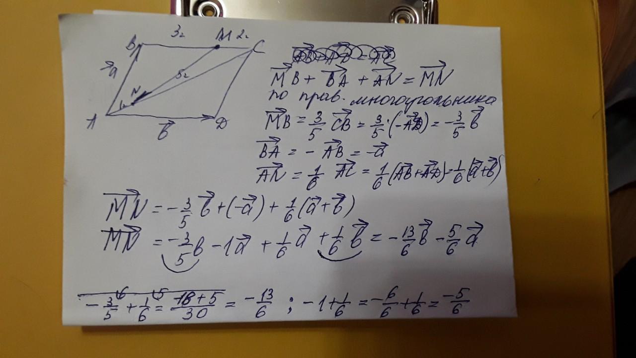 В параллелограмме ABCD точка М делит сторону ВС в отношении 3:2, а точка N делит диагональ АС в отношении 1:5. Найти разложение вектора MN по векторам a=AB и b=AD.