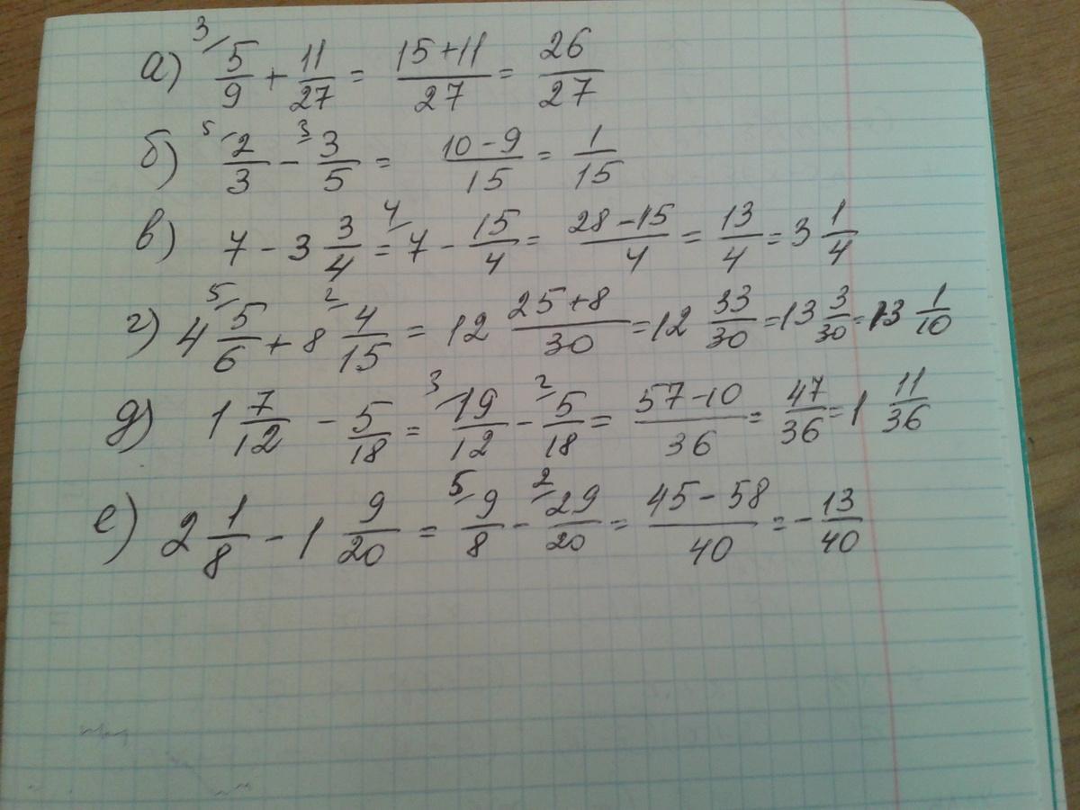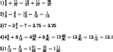 а) 5/9 + 11 /27 = 5 · 3/ 9 · 3 + 11 · 1 /27 · 1 = 15 /27 + 11 /27 = 15 + 11/ 27 = 26 /27 ≈ 0.9