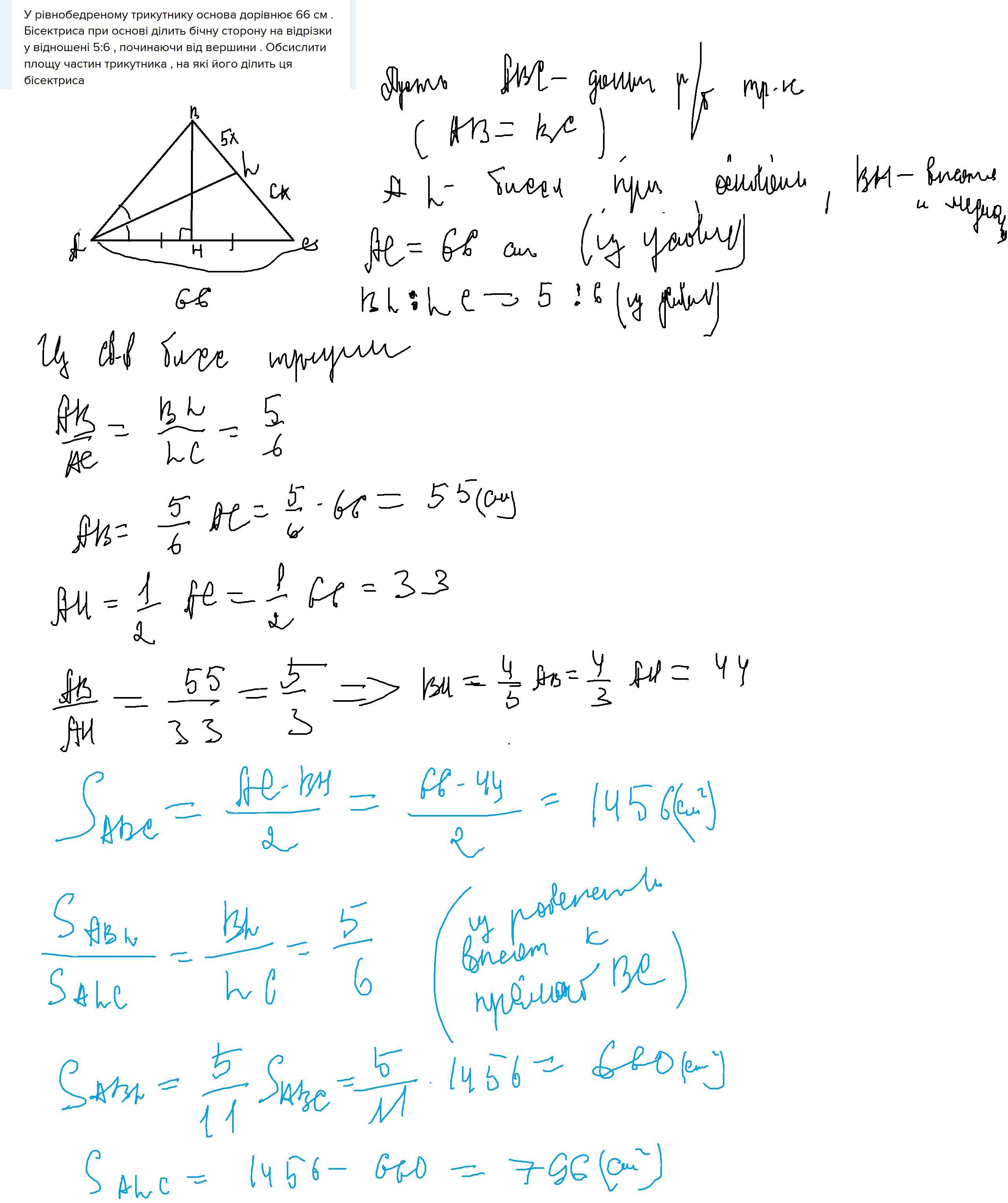 у рівнобедреному трикутнику основа дорівнює 66 см . Бісектриса при основі ділить бічну сторону на відрізки у відношені 5:6 , починаючи від вершини . Обсислити площу частин трикутника , на які його ділить ця бісектриса