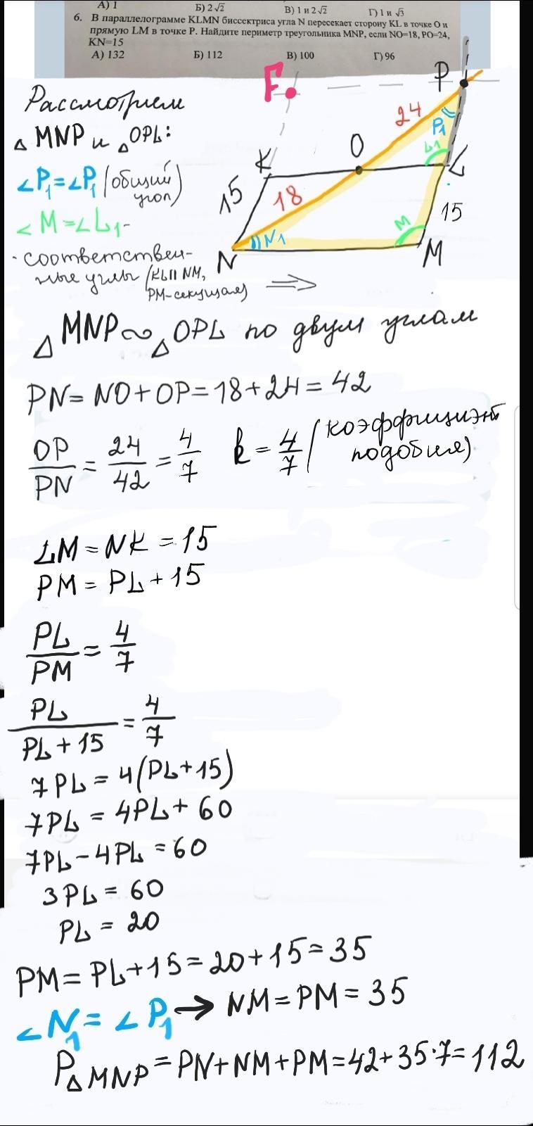 FPMN -параллелограмм,угол N = углу Р,т.к противоположные углы параллелограмма равны,а биссектрисса делит их пополам,значит <N1=<P1 и треугольник МNP- равнобедренный,