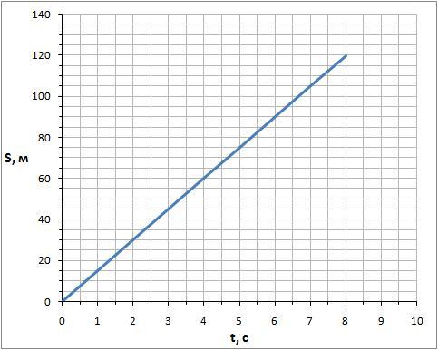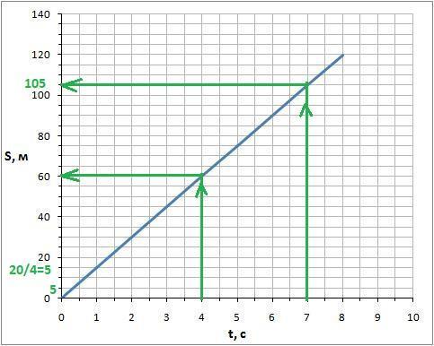 На рисунке представлена зависимость пройденного пути от времени катера. Какой путь прошел катер за 4 и за 7 секунд после начала движения?