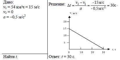Вагон движется равноускоренно с ускорением —0,5 м/с2. Начальная скорость вагона равна 54 км/ч. Через сколько времени вагон остановится? Постройте график зависимости скорости от времени.