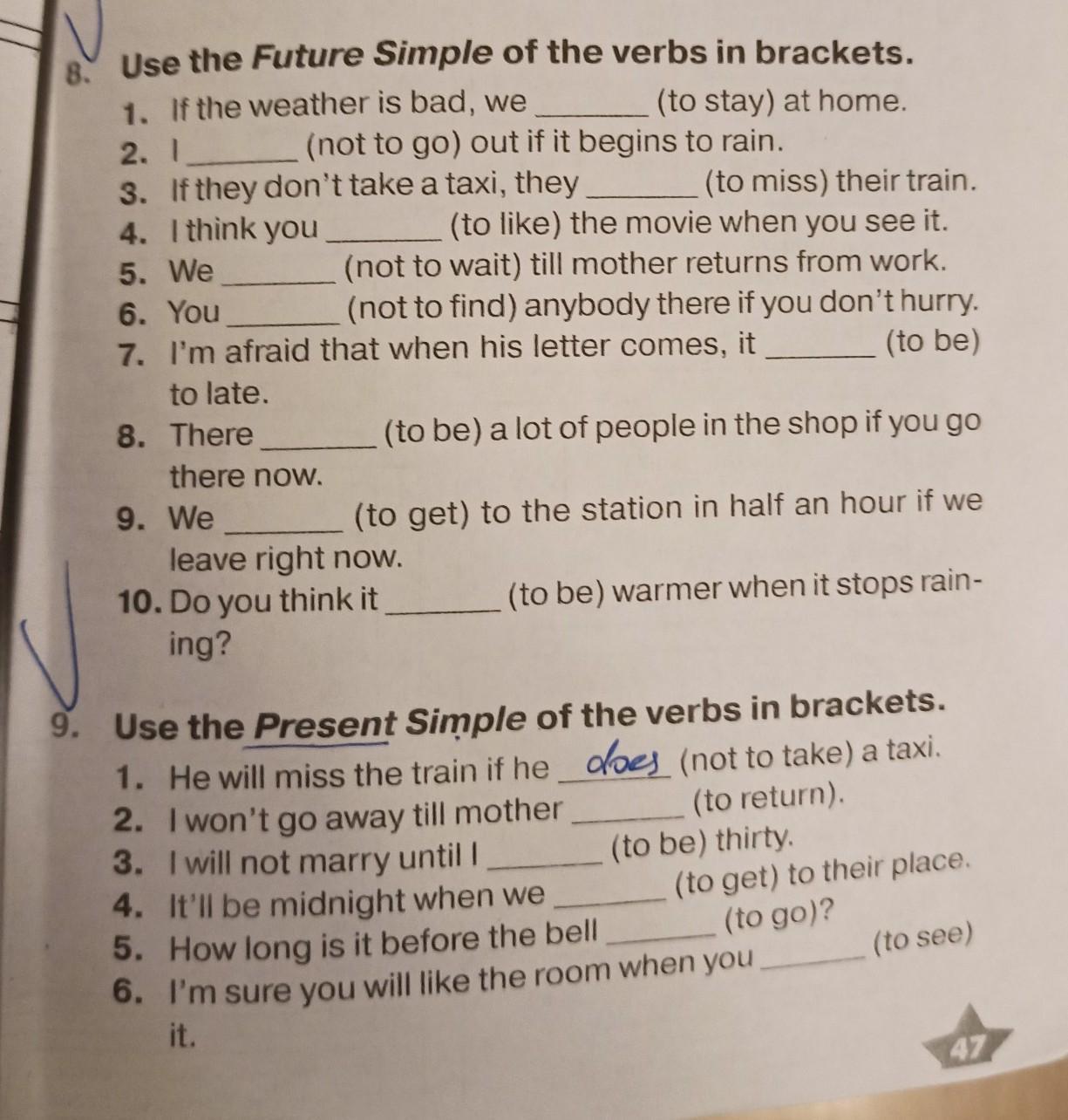Для образования Future Simple в повествовательном (утвердительном) предложении достаточно поставить вспомогательный глагол will перед смысловым глаголом в скобке, а глагол в скобке употребить без частицы "to"