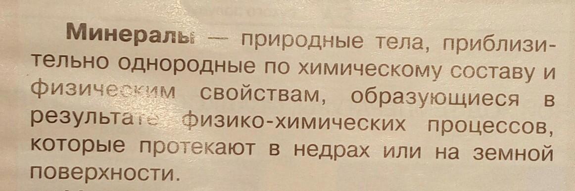 МИНЕРАЛЫ — это однородные по химическому составу и физическим свойствам природные тела. Они образовались в результате физико-химических процессов, которые протекают на поверхности Земли и в ее недрах. Минералы — составные части горных пород. Большинство минералов твердые, имеющие кристаллическое строение, способные образовывать многогранники (кристаллы) . Кроме твердых есть и жидкие минералы (ртуть, вода) , газовые (метан, углекислота) .