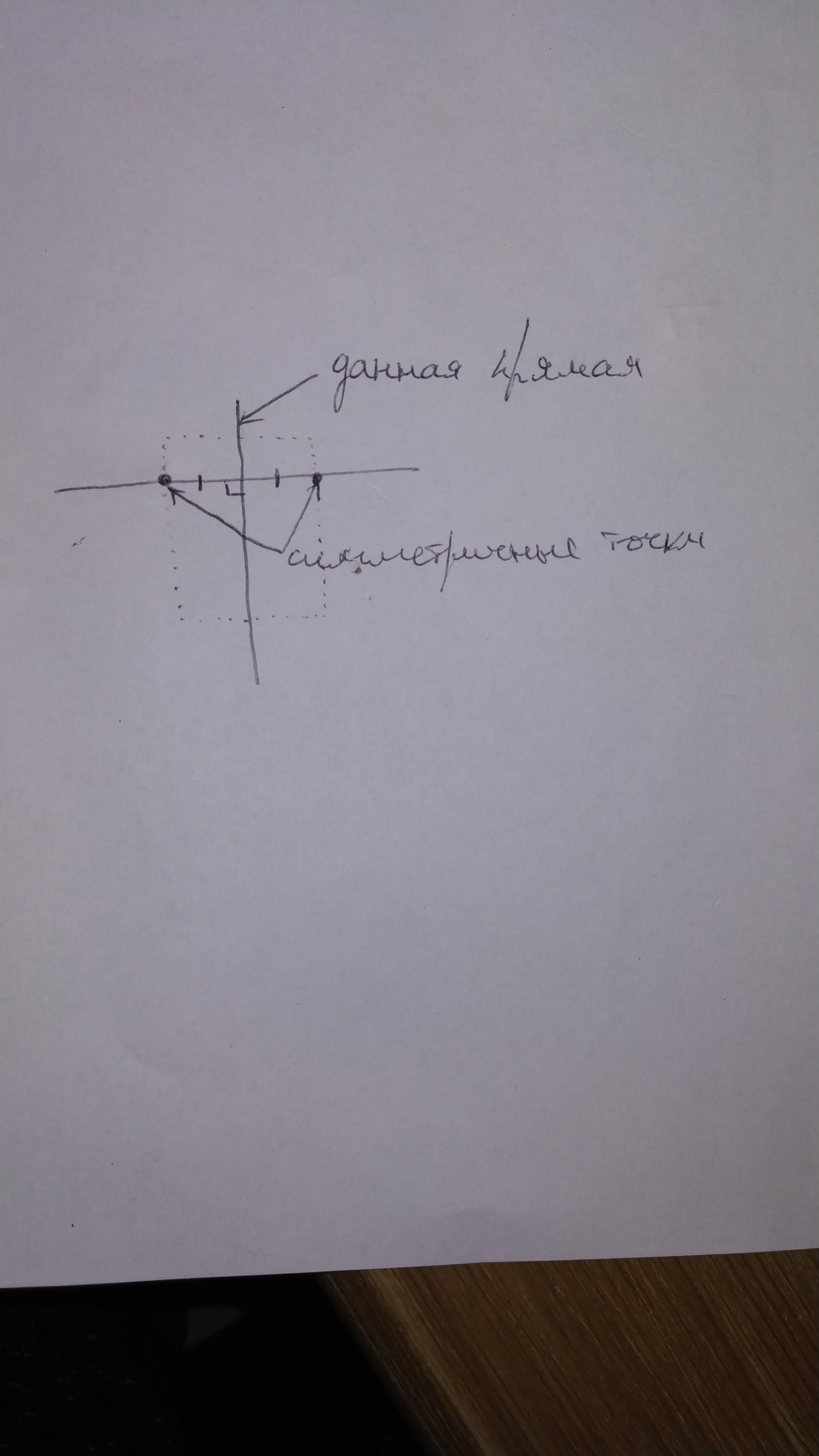 3) Откладываем от данной прямой на продолжении начерченной отрезок равный по длине расстоянию от нашей точки, до данной прямой.