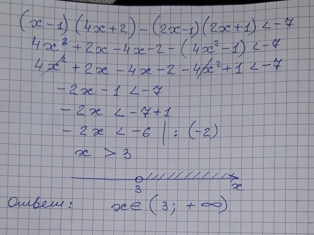 4х^2+2х-4х-2-(4х^2-1)<-7= 4х^2+2х-4х-2-4х^2+1<-7=