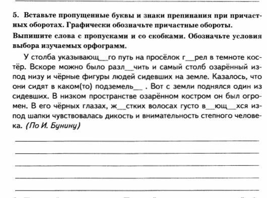 Ответ:У столба, указывающЕго путь на просёлок, гОрел в темноте костёр. Вскоре можно было разлИчить и самый столб, озарённый из-под низу, и чёрные фигуры людей, сидевших на земле. Казалось, что они сидят в каком-то подземельЕ. Вот с земли поднялся один из сидевших. В низком пространстве, озарённом костром, он был огромен. В его чёрных глазах, жЁстких волосах, густо вЬющИхся из-под шапки, чувствовалась дикость и внимательность степного человека.