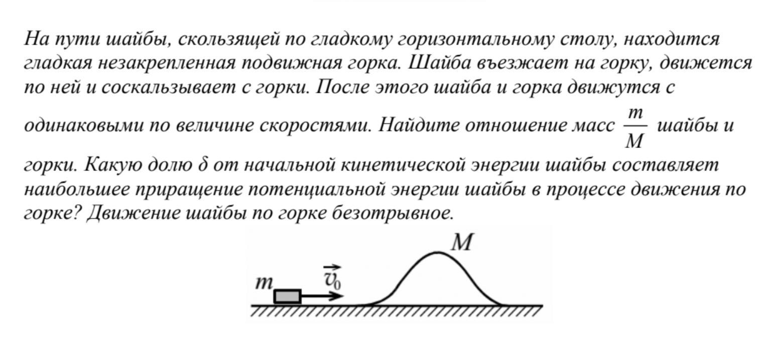 Наибольшее приращение потенциальной энергии происходит в тот момент времени , когда горка и шайба движутся, как единое целое, при этом по закону сохранения импульса: