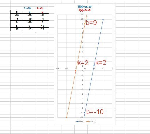 1) у=2х-10 и у=2х+9 - k=2 и k=2, 2=2, значит графики этих функций параллельны.