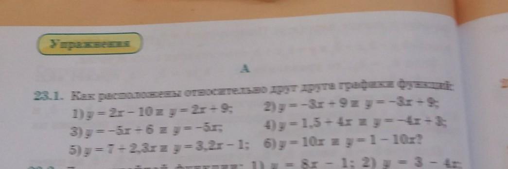 у=2.3х+7 и у=3.2х-1; 2.3≠2.3, значит прямые пересекаются.