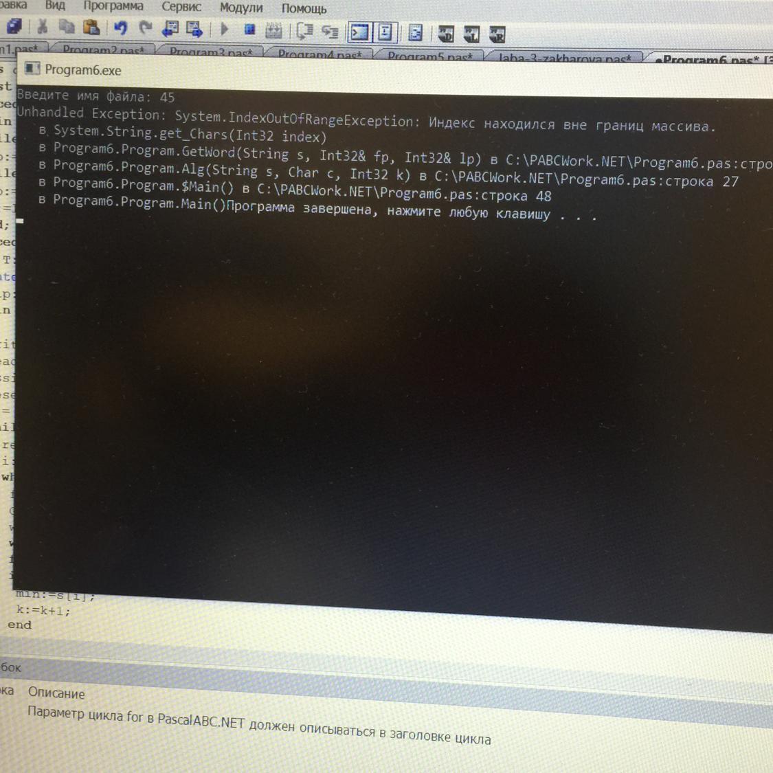 Вам же ясно написано: индекс находился вне границ массива. И далее указаны номера строк в программе, где произошла ошибка. Если там действительно есть обращение к элементу массива - проверяйте логику программы и введенные значения переменных, которые могнли привести к такому результату. Если нет - такое бывает при ошибке в библиотечных программах самой системы, но опять же, в случае некорректного ввода данных.