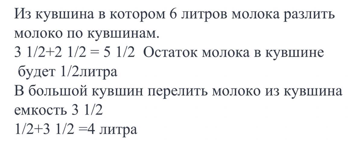 В кувшине 6 л молока.Используя сосуды емкостью 3целых 1/2 и 2 целых1/2 л, как можно в кувшине оставить 4 л молока