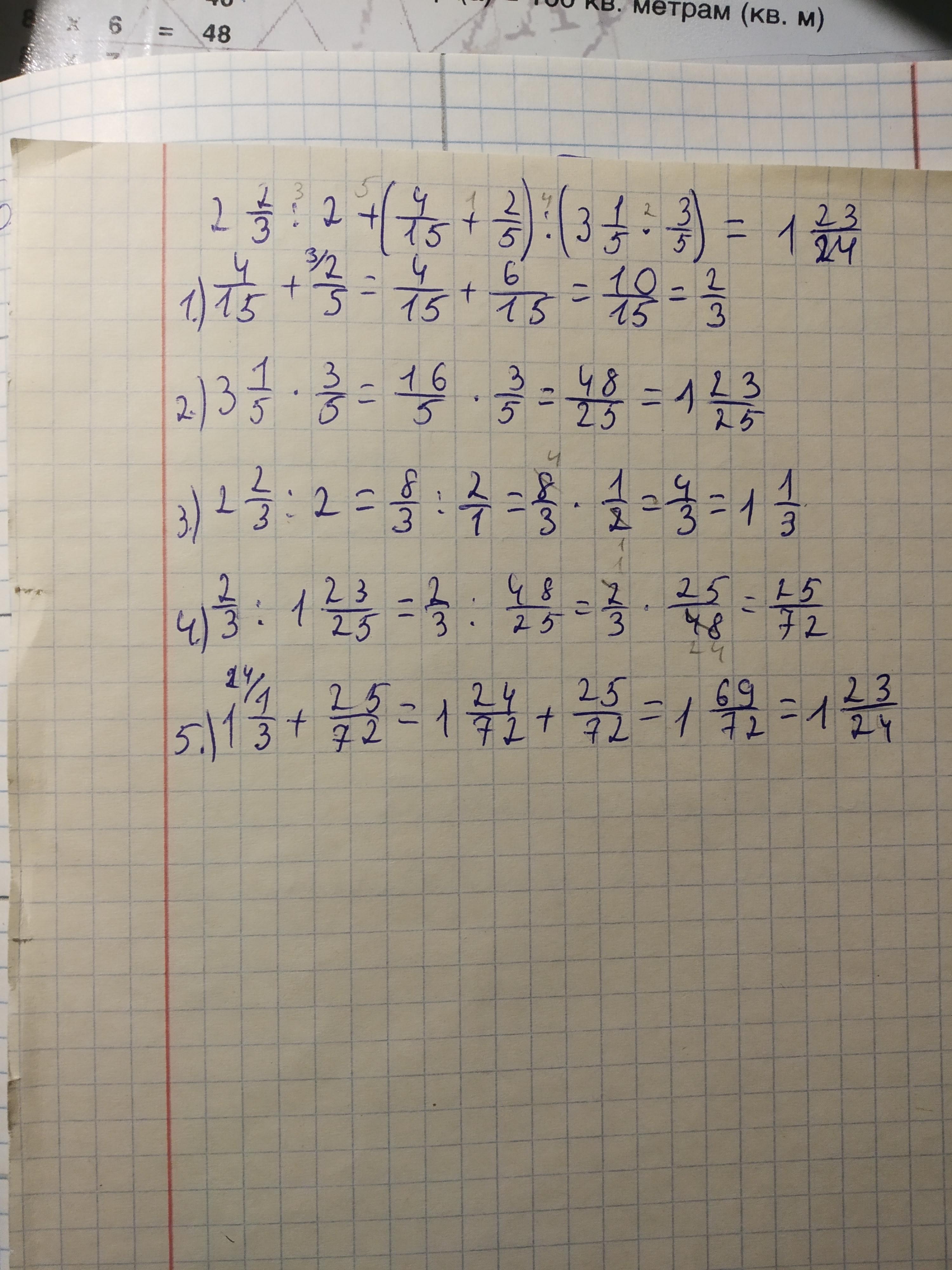 выполнит деление смешанных дробей:2 целых 2/3:2+(4/15+2/5):(3целых1/5*3/5),