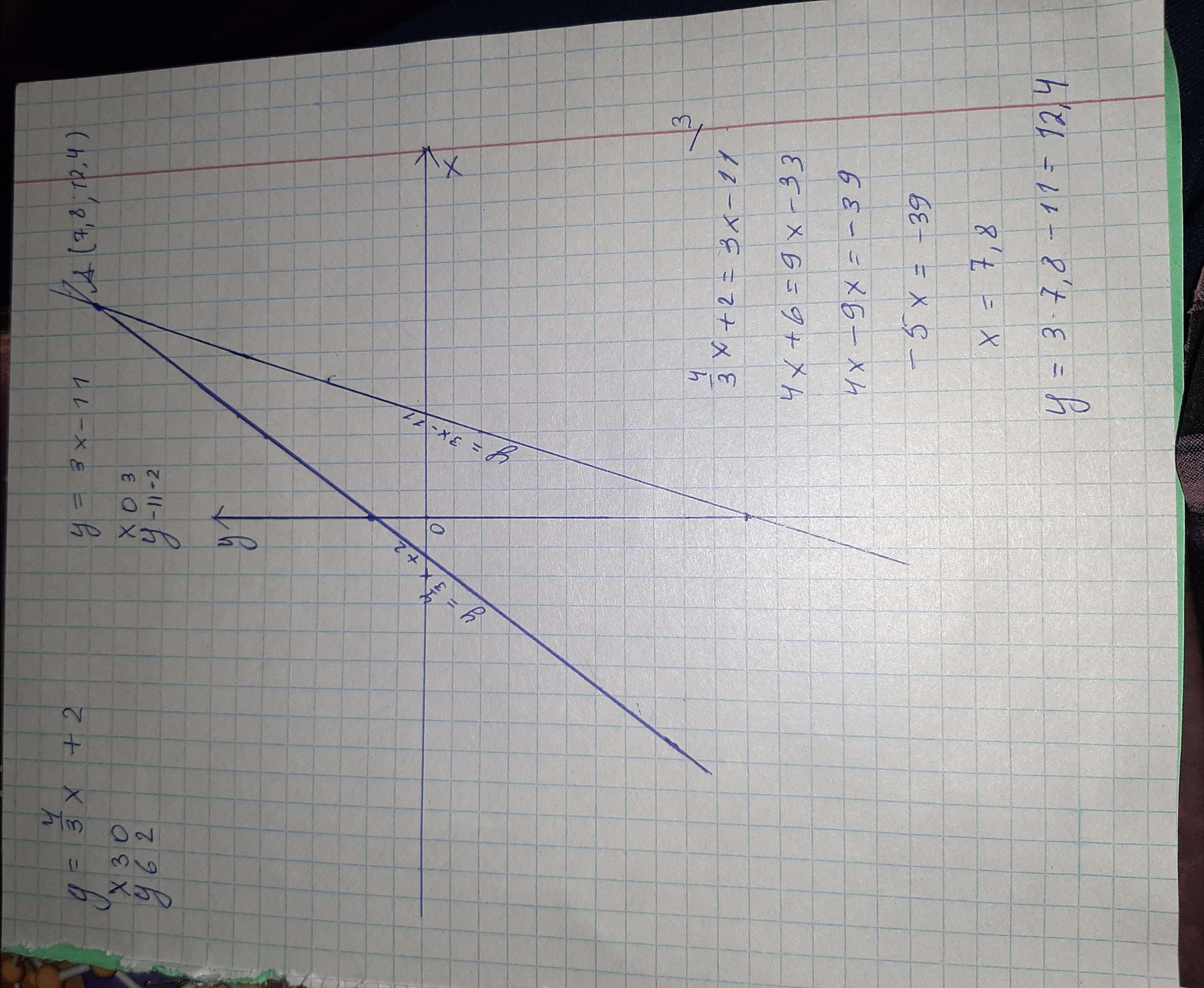 4) у = 4/3 х + 2 и у = 3х – 11.