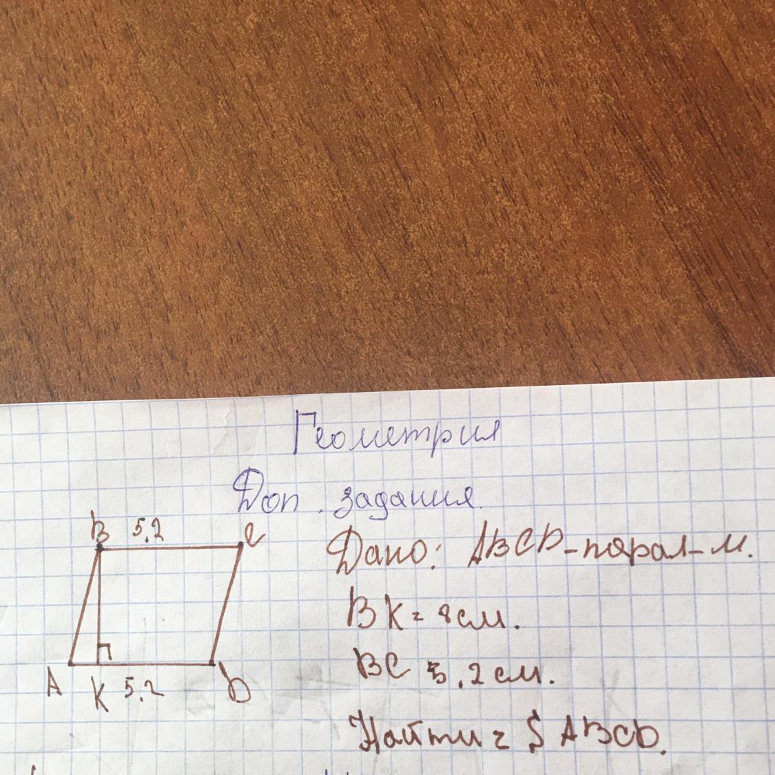 площадь параллелограмма равна : основание умноженное на высоту => в данном случае S=BC*AB =5,2*8=41,6