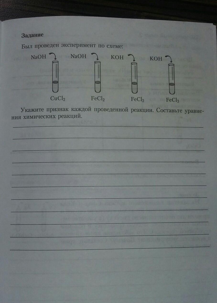 был определен эксперемн по схеме: NaOH + CuCl2;NaOH + FeCl2;KOH+FeCl2;KOH+FeCl3. Укажите признак каждой проведенной реакции.Составте уравнение химической реакции.