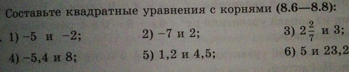подобные задания решаются с помощью теоремы Виета: если вам даны два корня и требуется восстановить квадратное уравнение, необходимо вспомнить, что второй коэффициент (В) равен сумме корней с противоположным знаком (в вашем случае В= -(2+5)=-7), коэффициент С (его ещё называют свободным членом) равен произведению этих корней (2*5=10).