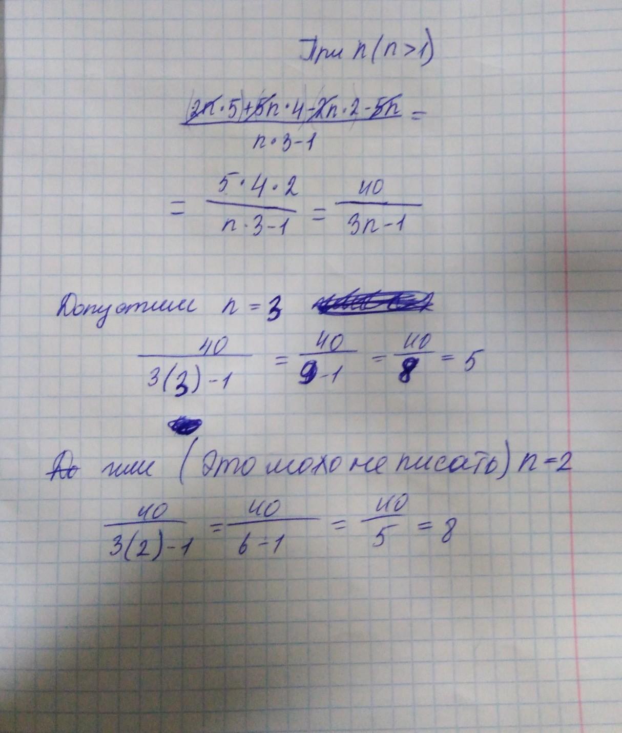 В начале идёт решение примера, а дальше доказательство. Мы берём допустимые значения n ( n>1), мы видим, что при любом значении n>1 это выражение делимо
