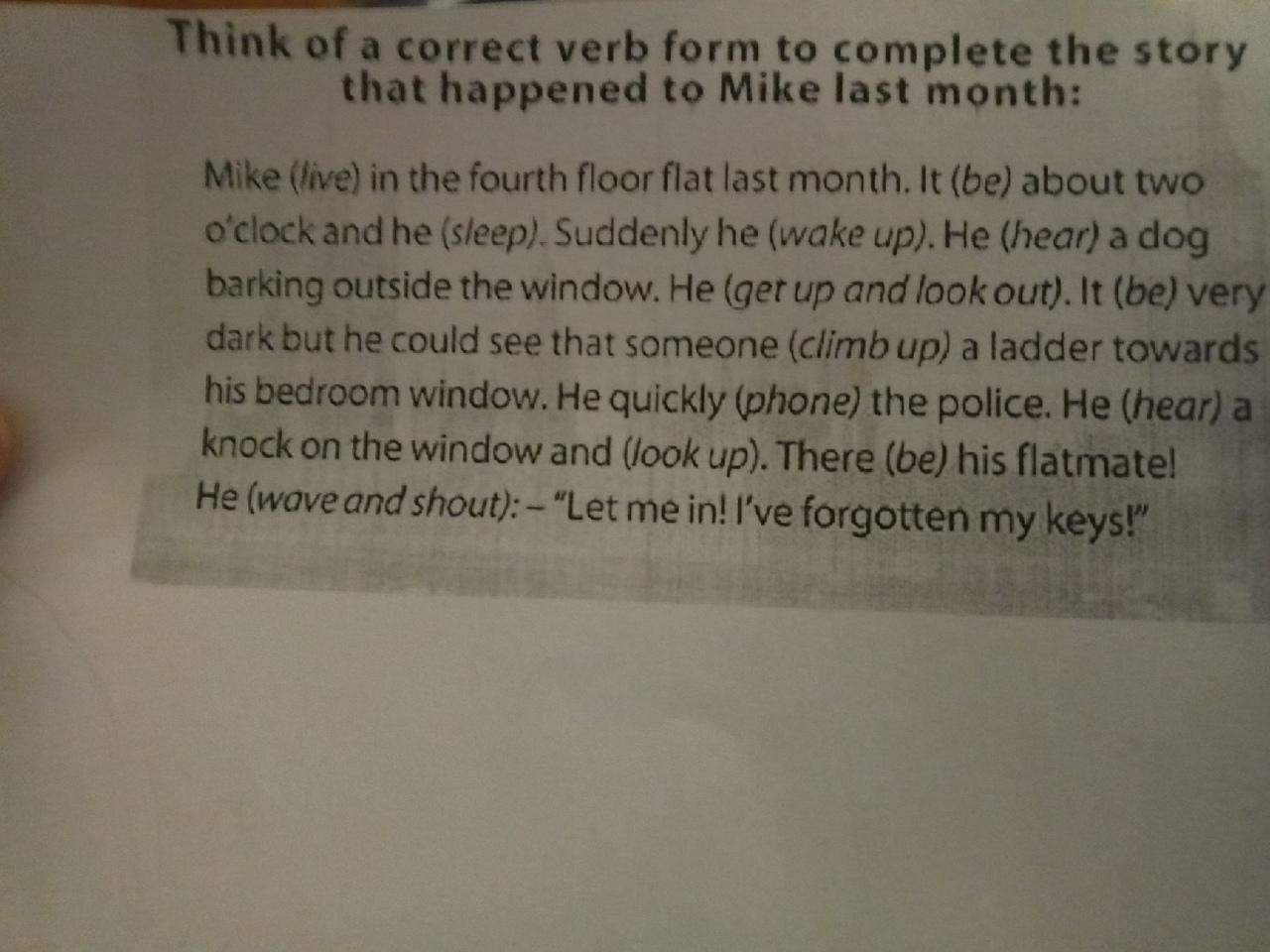 lived, was, slept, wakes up, heard, got up and looked out, was, climbed up, phoned, heard, looked up, was, waved and shouted