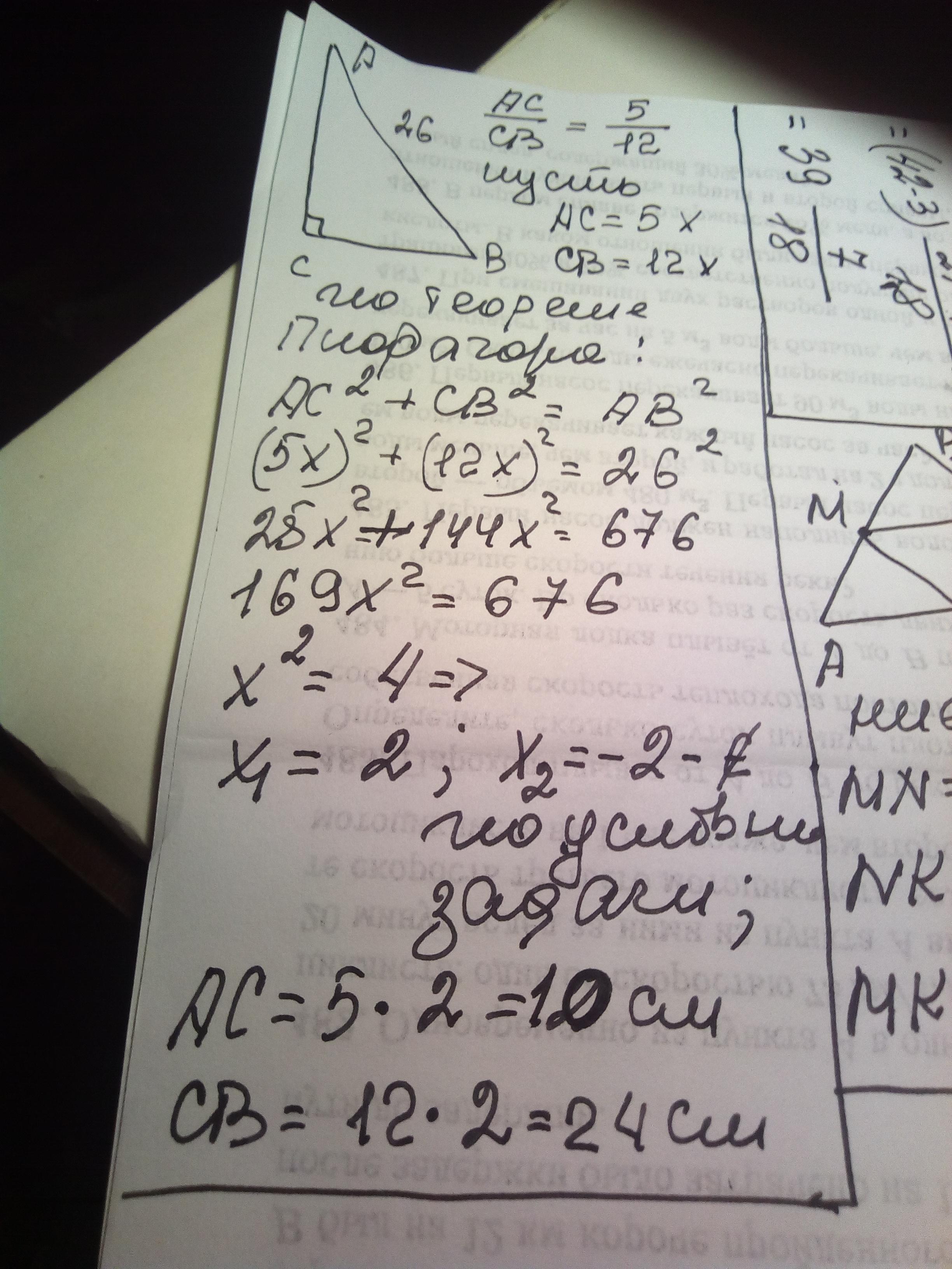 Найдите стороны прямоугольного треугольника, в котором гипотенуза равна 26 см, а отношение катетов 5:12 (подсказка, нужно найти x,y и z