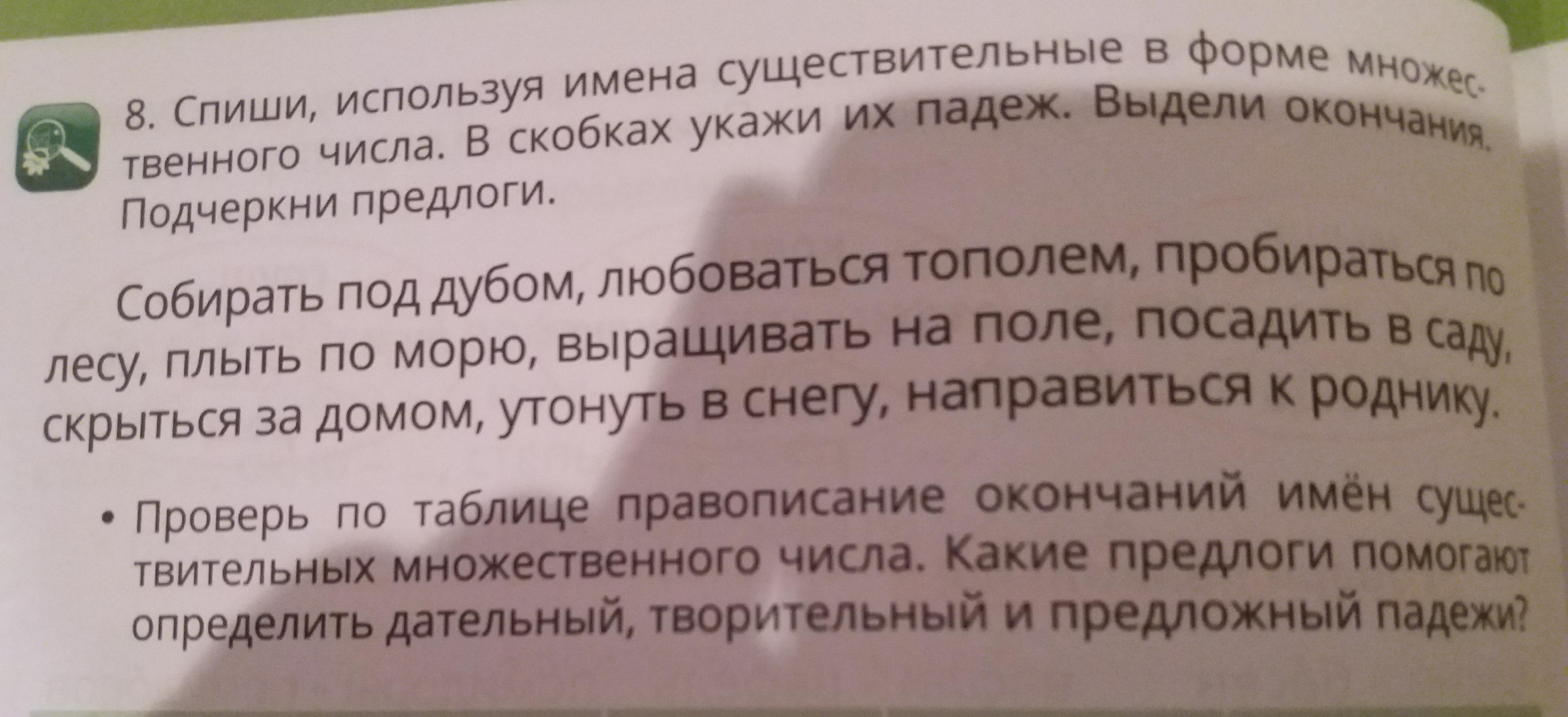 собирать под дубами(Т.п) любоваться тополями(Т.п), пробираться по лесам(Д.п), плыть по морям(Д.п), выращивать на полях(П.п), посадить в садах(П.п), скрыться за домами(Т.п), утонуть в снегах(П.п), направиться к родникам(Д.п)