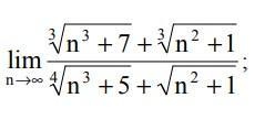 \displaystyle\lim_{n\to\infty}\frac{\sqrt[3]{n^3+7}+\sqrt[3]{n^2+1}}{\sqrt[4]{n^3+5}+\sqrt{n^2+1}}=\frac{\infty}{\infty}=\lim_{n\to\infty}\frac{n(\sqrt[3]{1+\frac{7}{n^3}_{\to0}}+\sqrt[3]{\frac{1}{n}_{\to0}+\frac{1}{n^3}_{\to0}})}{n(\sqrt[4]{\frac{1}{n}_{\to0}+\frac{5}{n^4}_{\to0}}+\sqrt{1+\frac{1}{n^2}_{\to0}})}=\\=1
