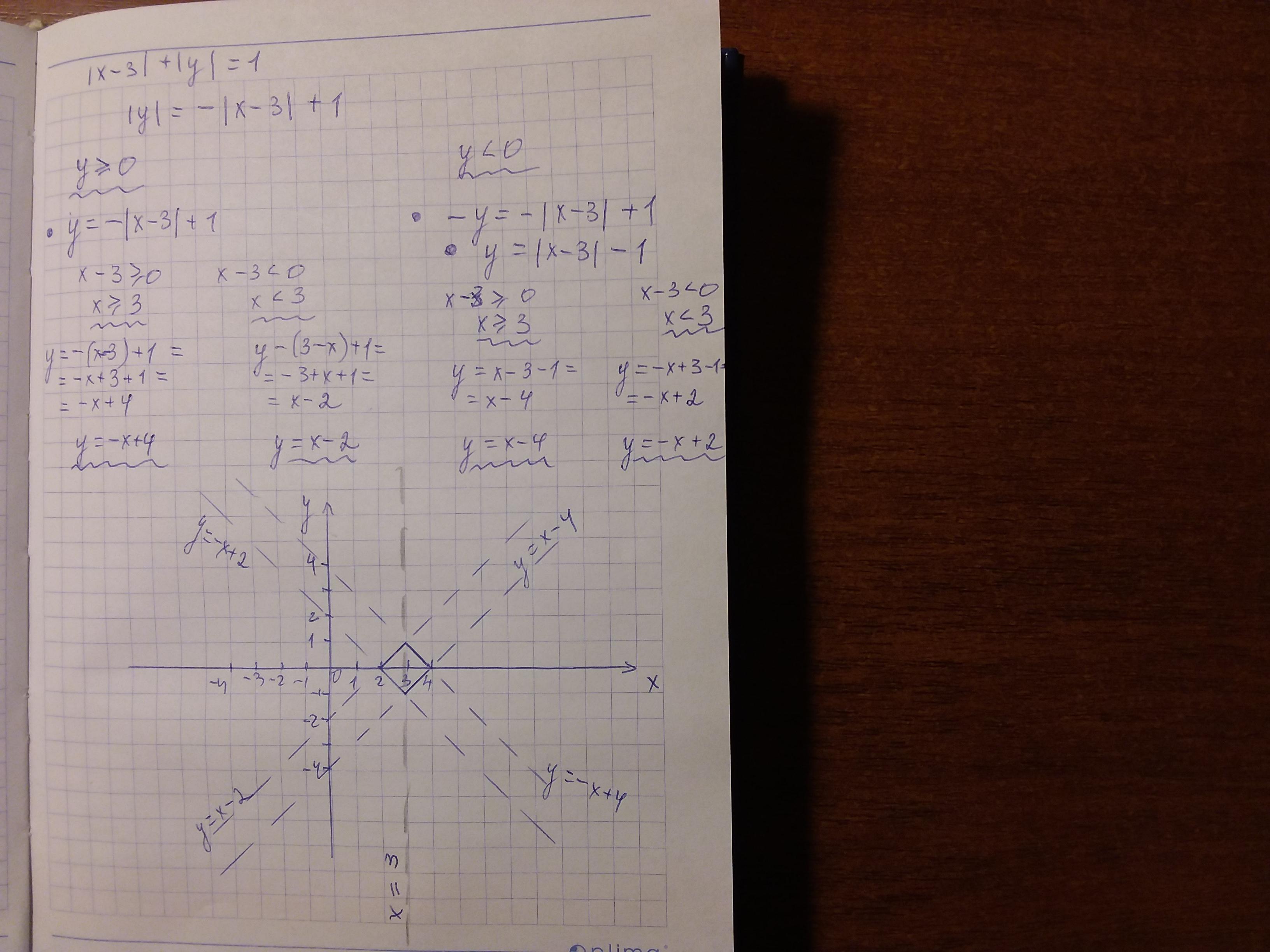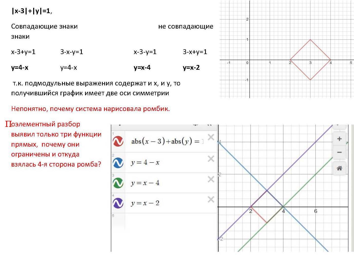 Хм. И во втором раскрытии модуля, подставив пропущенный минус, ответ оказался таким же (просто при записи потерялся) 3-x-y=-1 ⇒y=4-x; и в 4-м ошибка была, тогда получается 3-x+y=1 ⇒y=2-x, т.е. все равно четырех функций для 4-х сторон ромба не набралось у меня... :(