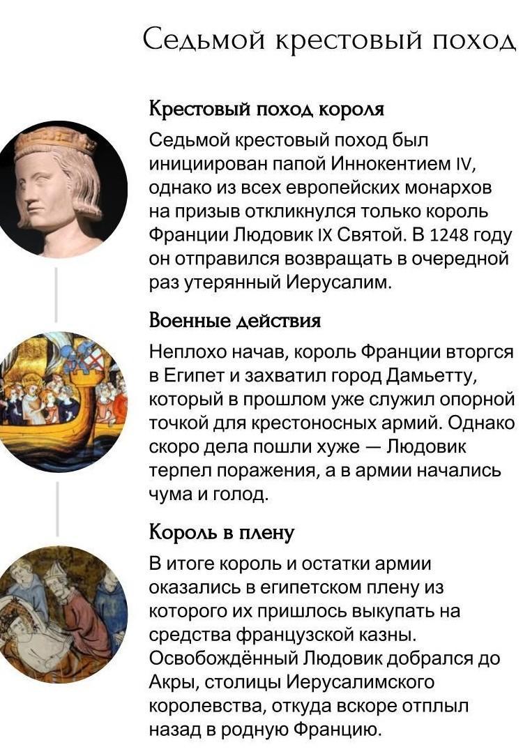 Если коротко то в 7 крестовом поход был построен на том, что Иннокентий IV пытал завоевать с Людовским Иерусалим и это всё привело к тому, что короля поймали и оказались в Египетском плену.