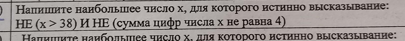 по условию нам нужно чтобы x было не больше 38 , а значит оно больше , а так же дано условие что сумма цифр числа x не равна 4 (2 условие под словом не - значит отрицание , а это еще значит что сумма цифр числа равна 4) итого , одно число которое подходит под все эти параметры это 31