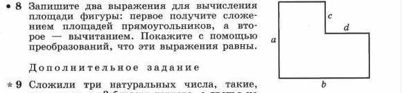 Запишите два выражения для вычисления площади фигуры : первое получите сложением площадей прямоугольников,а второе-вычитанием. Покажите с помощью преобразований,что эти выражения равны.