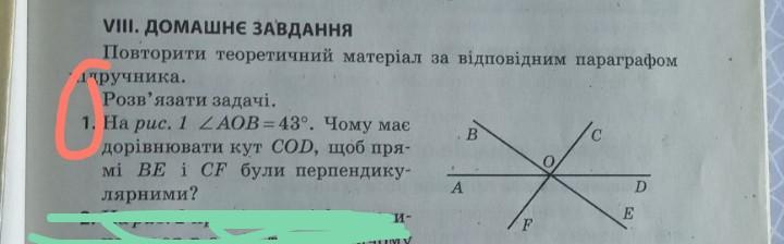 на рисунку 1 Кут АОВ=43 градуса.Чому має дорівнювати Кут СОD,щоб прямі ВЕ і СF були перпендикулярними