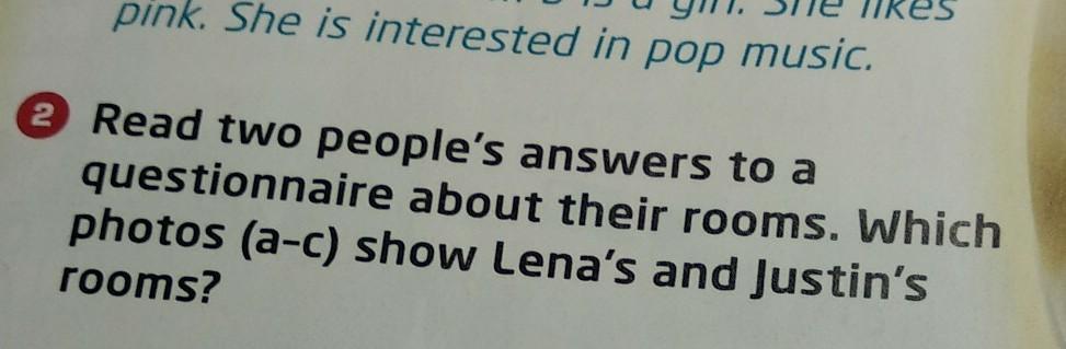 Прочитайте ответы двух людей на вопросник об их комнатах. Какие фотографии (а-с) показывают комнаты Лены и Джастина?