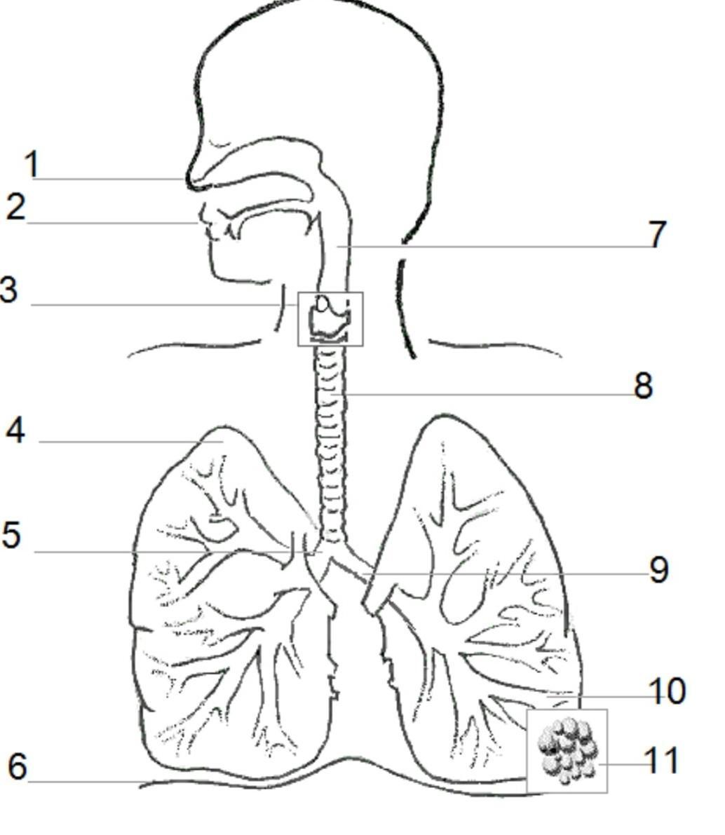 1нос, 2ротовая полость, 3гортань, 4легкое, 5бронх, 6диафрагма, 7глотка, 8трахея, бронх, 10бронхиальное дерево, 11алвеолы.