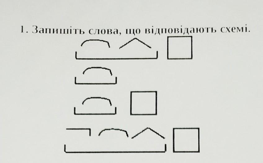 1. верхня дужка це корінь слова верхній трикутник це суфікс квадратик це закінчення а лінія нижня це основна частина.