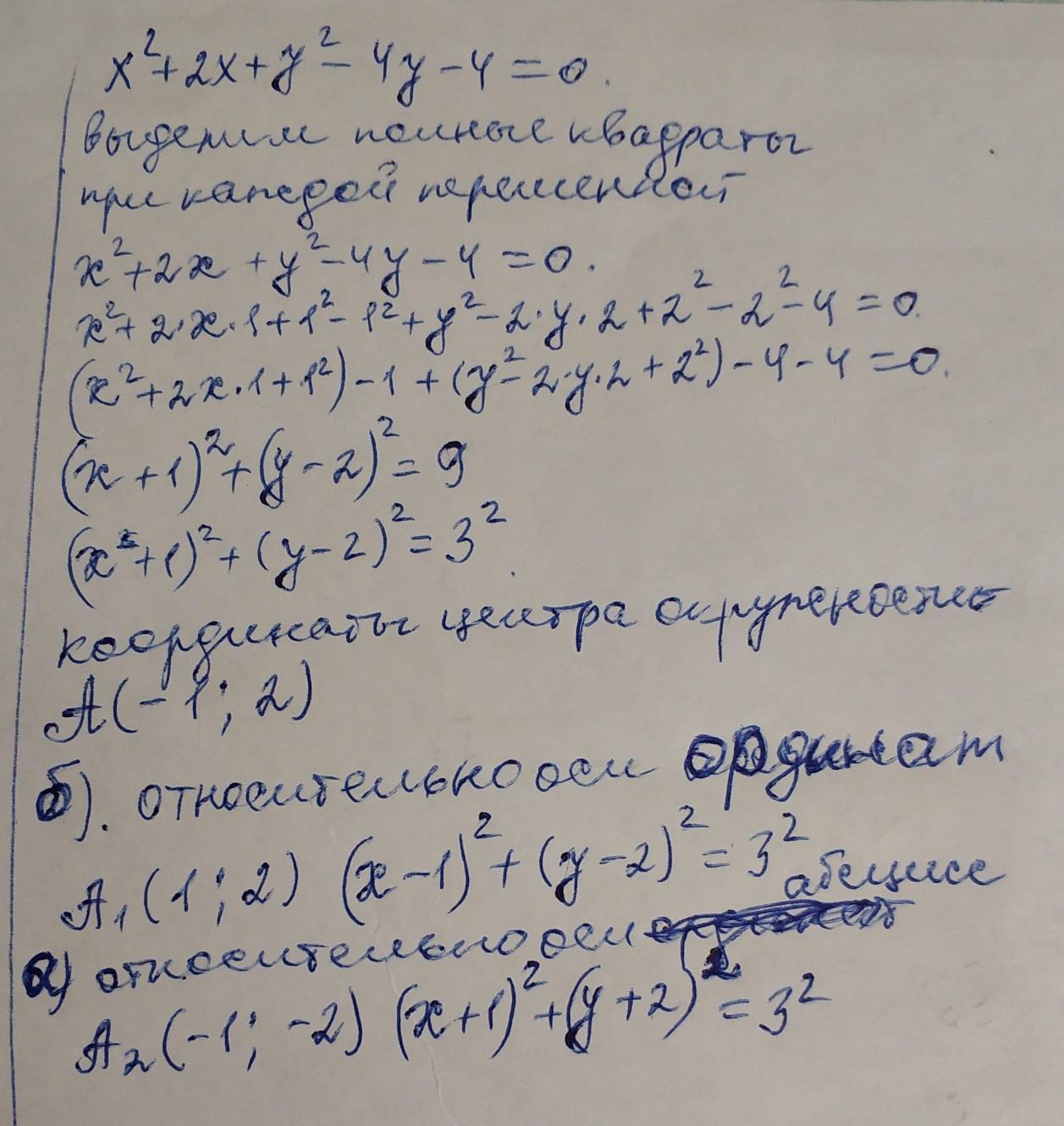 окружность на координатной плоскости заданы уравнением x^2+2x+y^2-4y-4=0.Напишите уравнение окружности, симметричной данной относительно а)оси абцисс ; б)ори ординат.