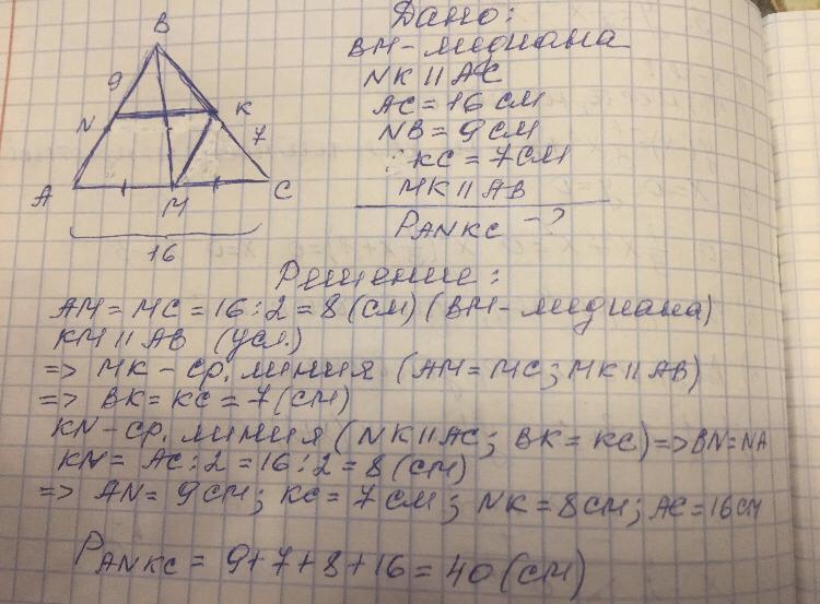 В треугольнике ABC проведена медиана BM, отрезки MK || AB, KN || AC. Найдите периметр четырёхугольника ANKC, если KB= 8см , AM= 9см , BN = 7см.