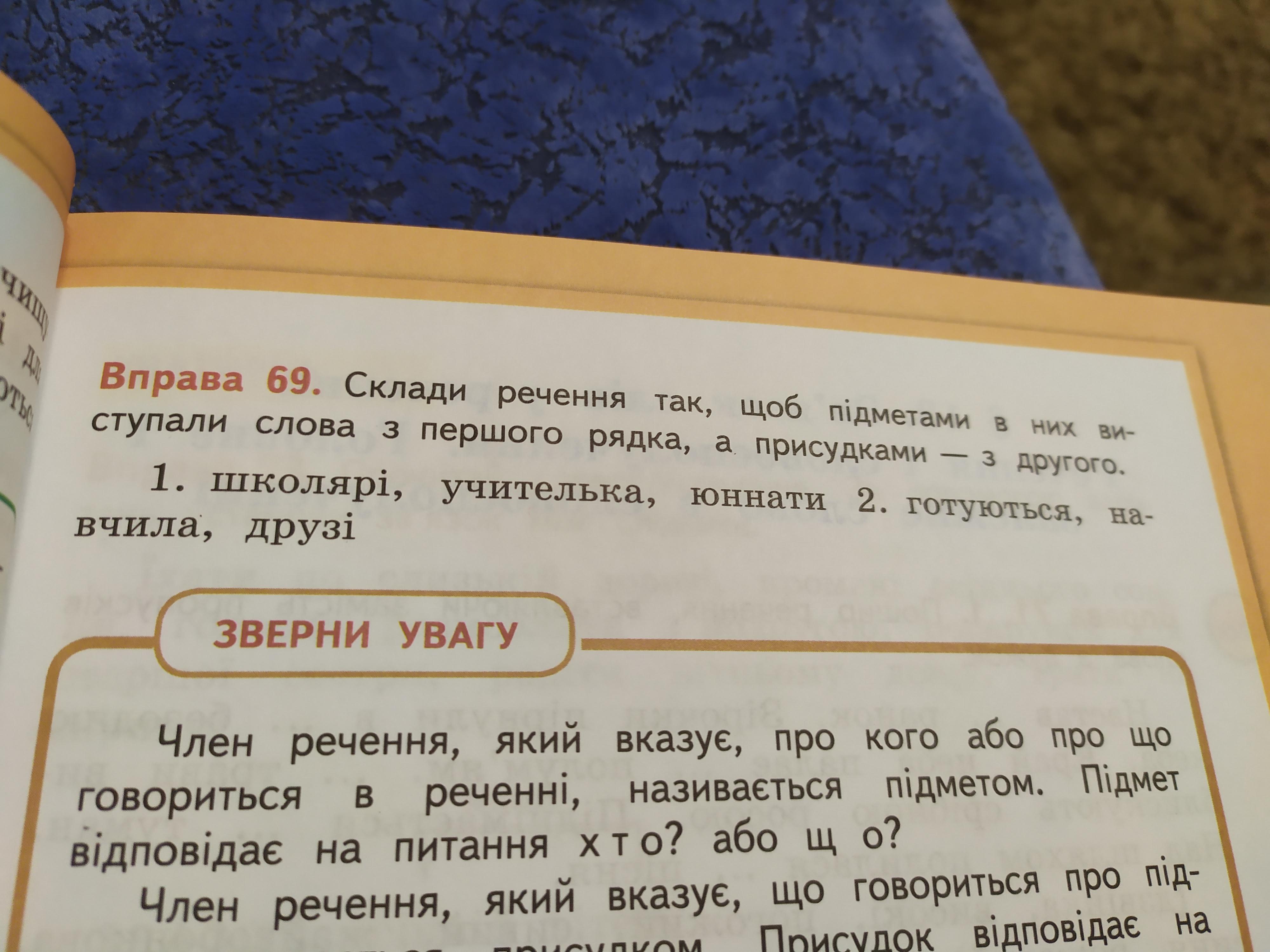 Ответ:1 Школярі готуються до контрольної роботи.2 Учителька навчила учнів додавати і віднімати.3 Юннати друзі успішно закінчили навчальний рік.