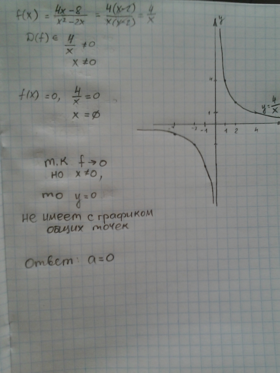 Постройте график функции y=4x-8/x^2-2x и определите, прикаких значениях параметра a прямая y=a не имеет с графиком общих точек