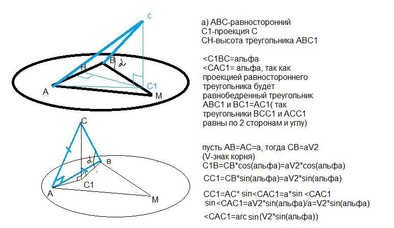 Сторона AB треугольника ABC лежит в плоскости ABM, а сторона BC образует с этой плоскостью угол АЛЬФА. Какой угол образует с этой плоскостью сторона АС, если а)треугольник равносторонний; б) AB=AC, угол CAB=90.