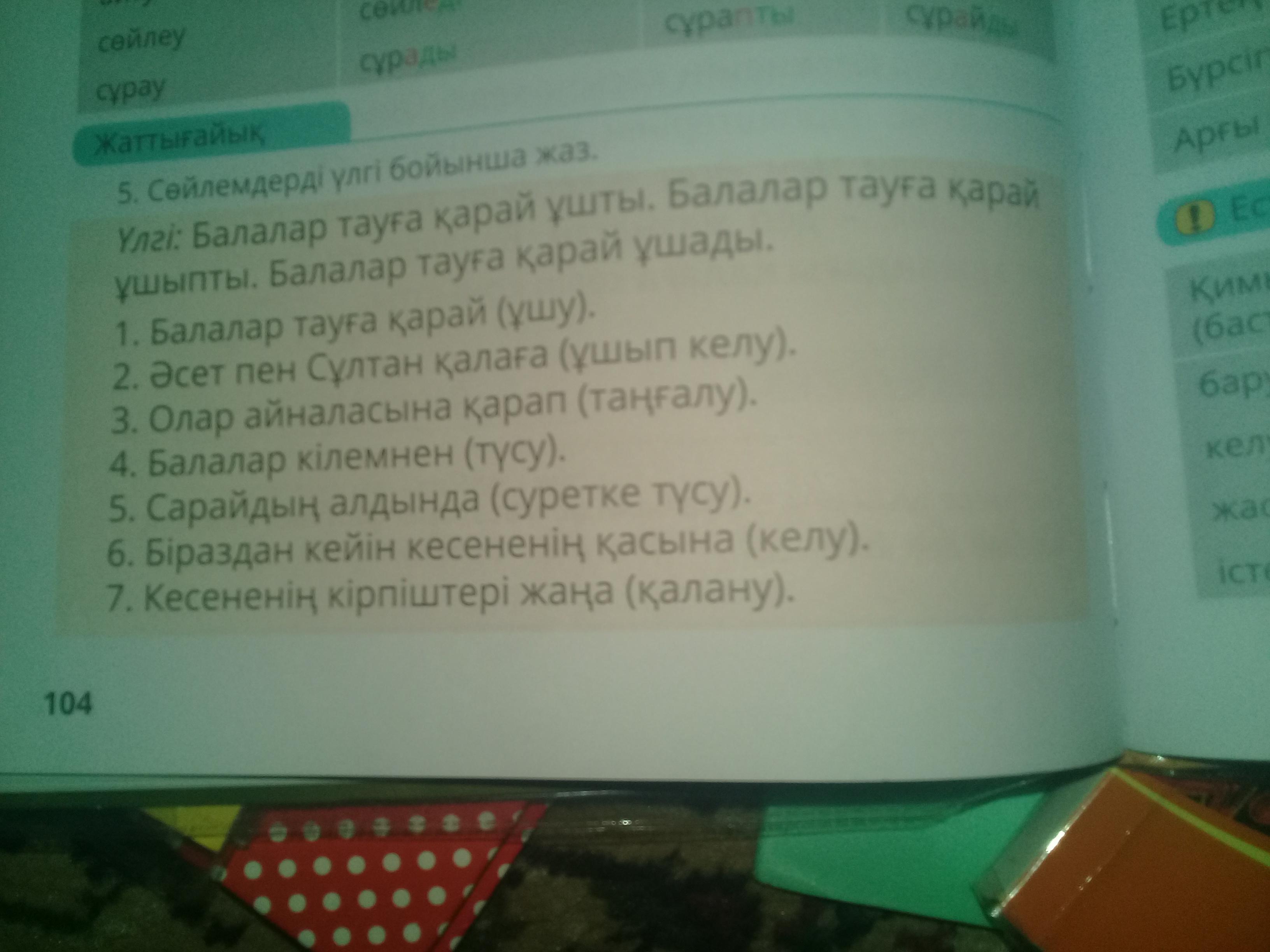 5)Сарайдың алдында суретке түсті.Сарайдың алдында суретке түсіпті.Сарайдың алдында суретке түседі.