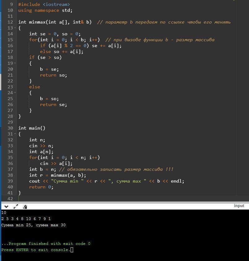 1. Написать функцию, которая принимает в качестве аргументов целочисленный массив и переменную. Находит сумму четных и сумму нечетных элементов. В переменную-аргумент сохраняет максимальную из сумм. Возвращает минимальную из сумм.