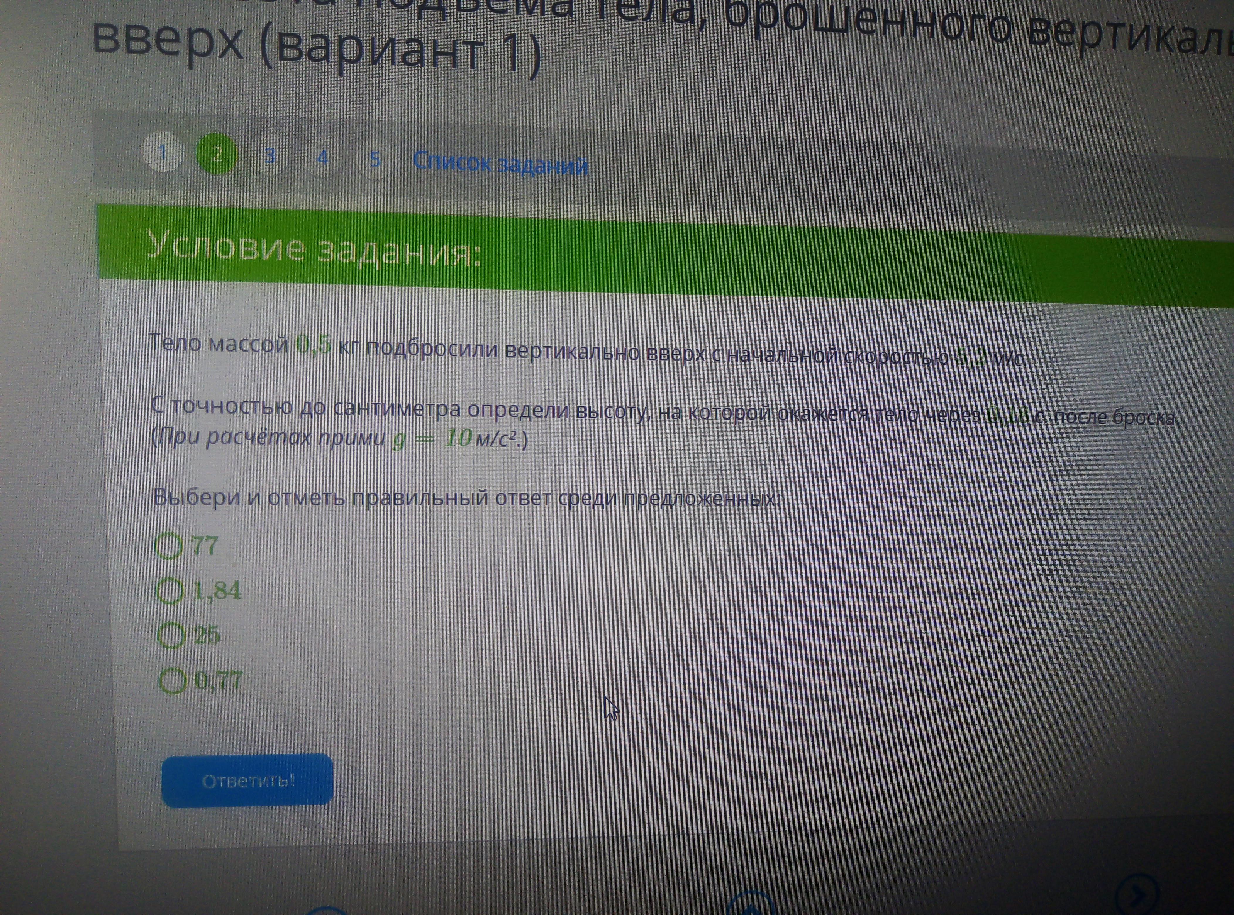 x=Vo*t -g*t^2/2 = 5.2*0.18 - (10*0.18^2)/2 =0.77 м