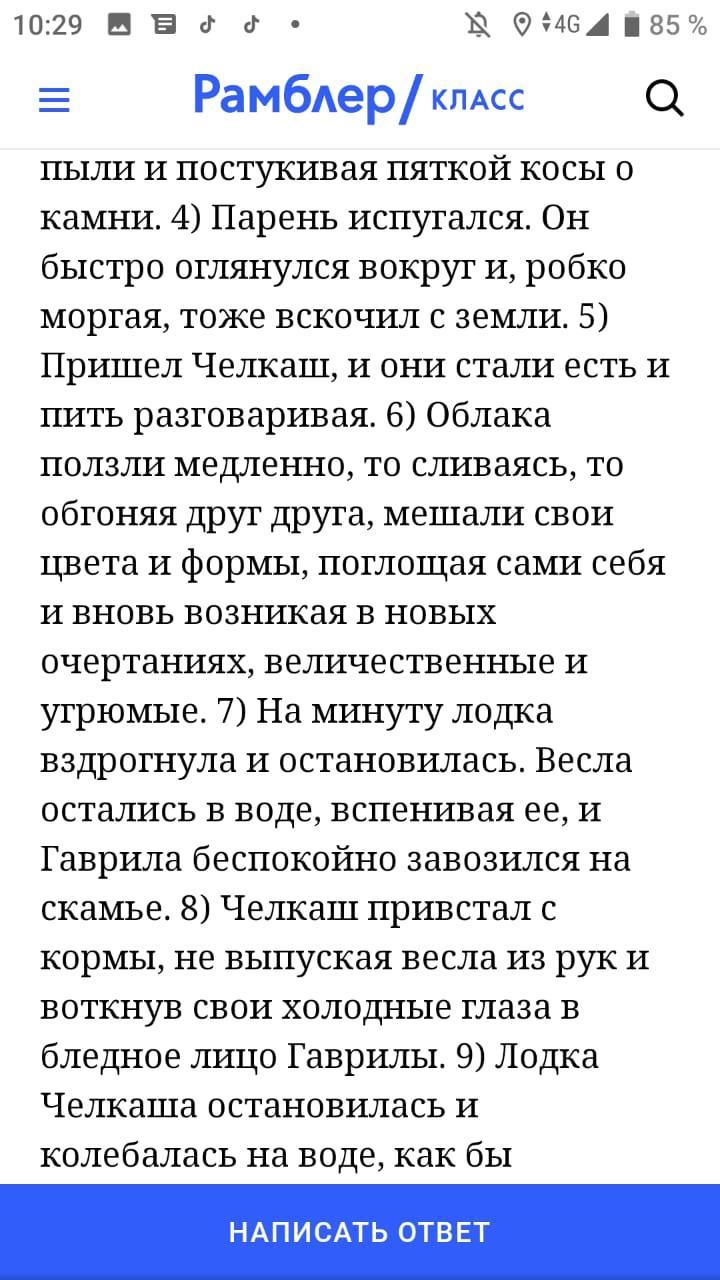 7) На минуту лодка вздрогнула и остановилась. Весла остались в воде, (лееприч. оборот) вспенивая ее, и Гаврила беспокойно завозился на скамье.